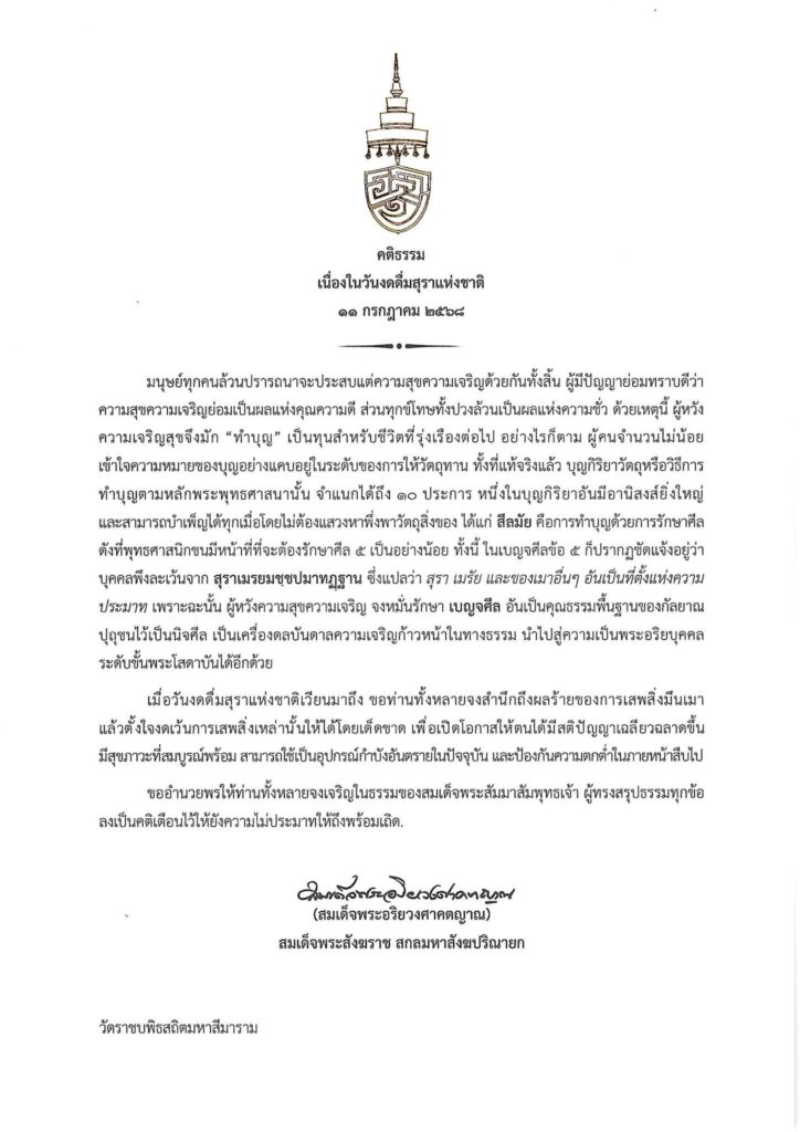 เจ้าพระคุณ สมเด็จพระอริยวงศาคตญาณ สมเด็จพระสังฆราช สกลมหาสังฆปริณายก ประทานพระคติธรรม เนื่องในวันงดดื่มสุราแห่งชาติ วันศุกร์ ที่ 11 กรกฎาคม 2568 ความว่า