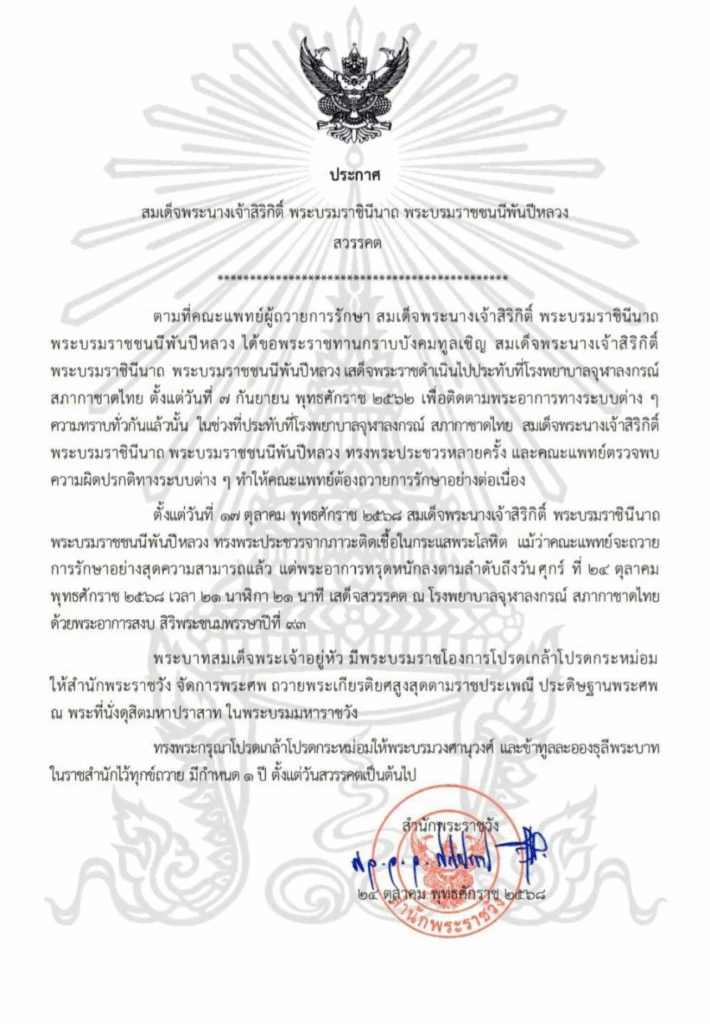 เมื่อเวลา 01.58 น. วันที่ 25 ตุลาคม สำนักพระราชวังออกประกาศว่า สมเด็จพระนางเจ้าสิริกิติ์ พระบรมราชินีนาถ พระบรมราชชนนีพันปีหลวง สวรรคต ความว่า
