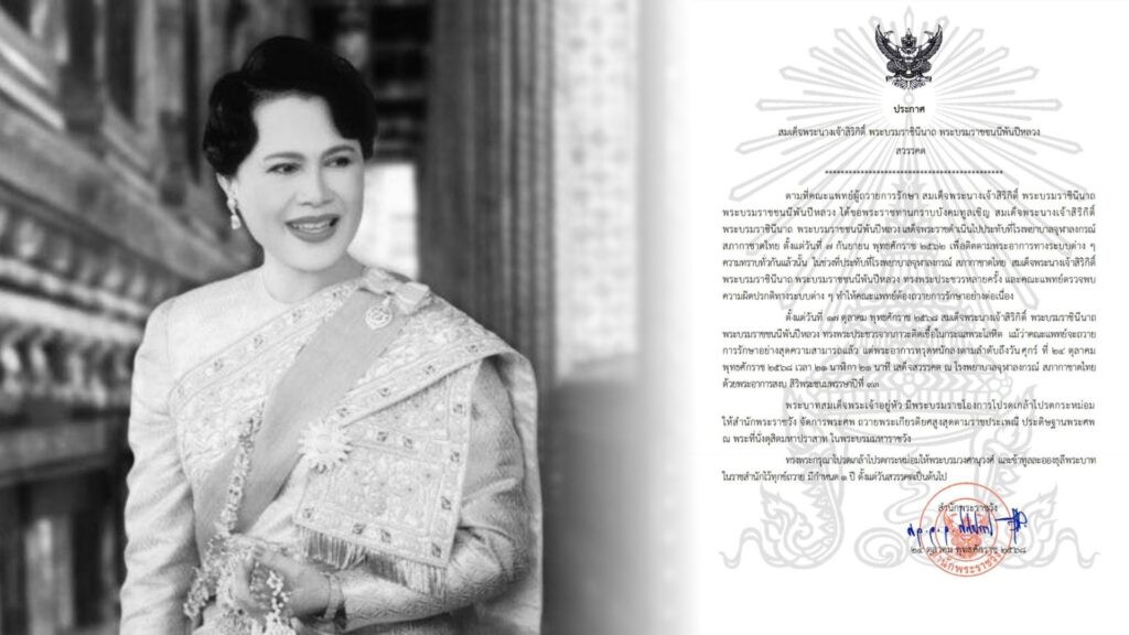 ตั้งแต่วันที่ 17 ตุลาคม พุทธศักราช 2568 สมเด็จพระนางเจ้าสิริกิติ์ พระบรมราชินีนาถ พระบรมราชชนนีพันปีหลวง ทรงพระประชวรจากภาวะติดเชื้อในกระแสพระโลหิต แม้ว่าคณะแพทย์จะถวายการรักษาอย่างสุดความสามารถแล้ว แต่พระอาการทรุดหนักลงตามลำดับ ถึงวันศุกร์ที่ 24 ตุลาคม พุทธศักราช 2568 เวลา 21 นาฬิกา 21 นาที เสด็จสวรรคต ณ โรงพยาบาลจุฬาลงกรณ์ สภากาชาดไทย ด้วยพระอาการสงบ สิริพระชนมพรรษาปีที่ 93