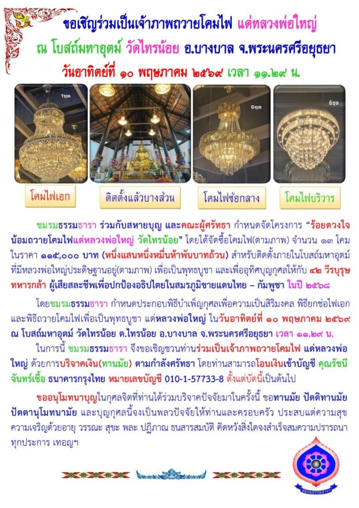 ชมรมธรรมธารา กำหนดจัดโครงการ “ร้อยดวงใจน้อมถวายโคมไฟ แด่หลวงพ่อใหญ่ วัดไทรน้อย”